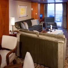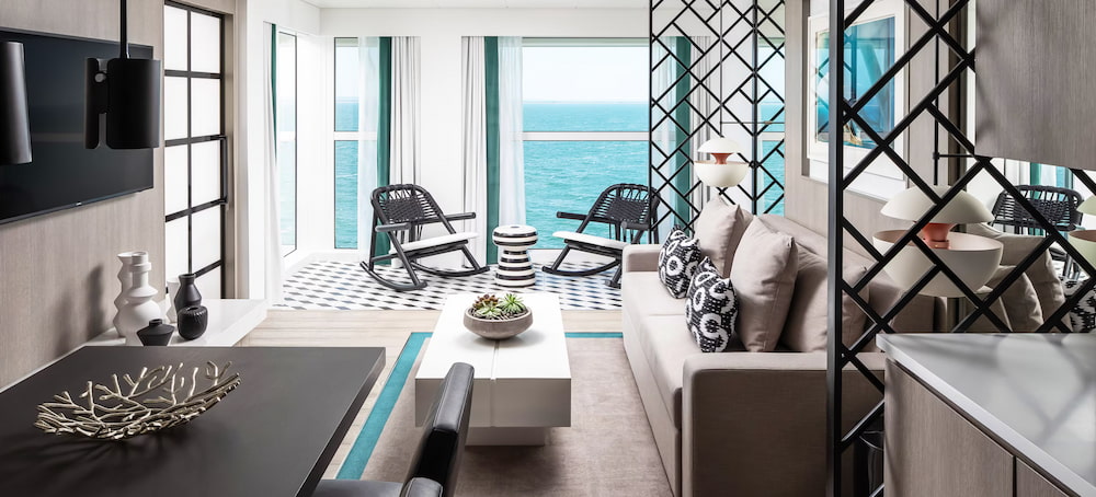 Unwind in a luxuriously large living area featuring floor to ceiling panoramic windows. The Royal Suite features the Cashmere™ Mattress, a primary bathroom with a large soaking tub, a separate shower, a double sink vanity, and a spacious private veranda. No matter where you are in this suite, you’ll enjoy stunning views of the sea, the way every royal should.