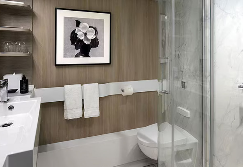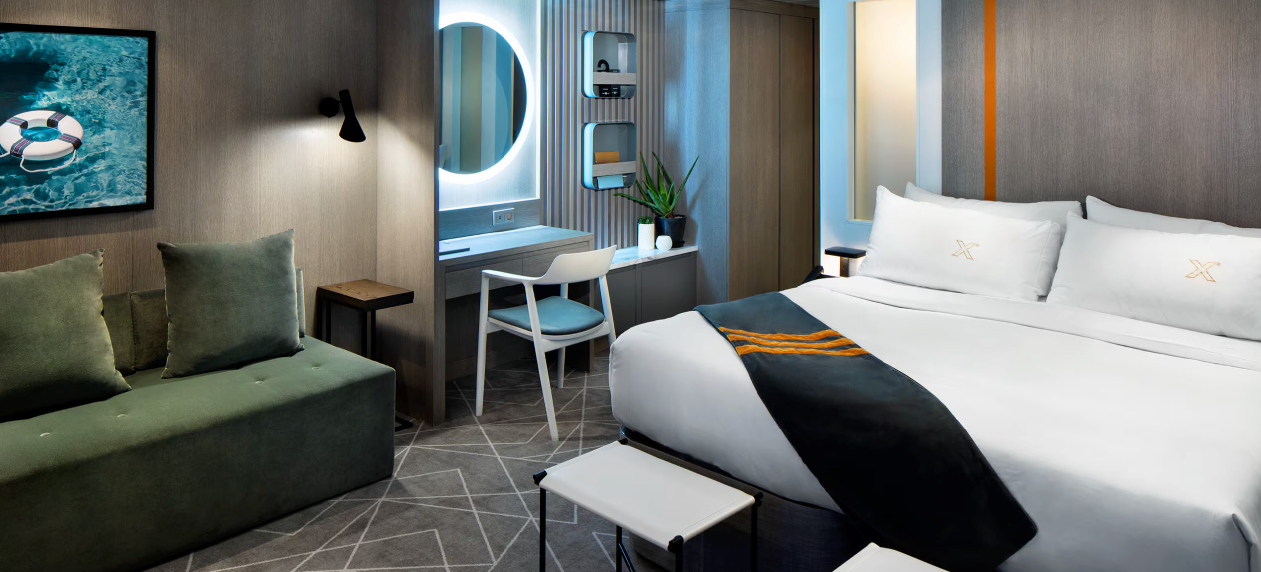 Please note that not all amenities available on the Celebrity Silhouette are included in this charter. Drinks and Wi-Fi are not included in the base price of a cabin on StarVista LIVE cruises. Stateroom images and features are samples only. Actual furniture, fixtures, colors and configurations may vary. All measurements are approximate. Lastly, the configuration of accessible staterooms may vary from the non-accessible stateroom shown here.